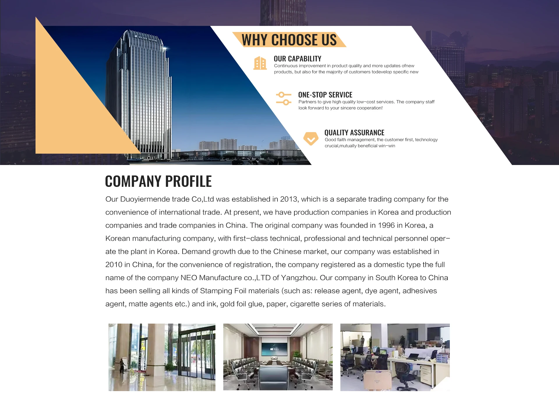 Productos principales:Químico de estampado en caliente, película de estampado en caliente, lámina de estampado en color, lámina de estampado, lámina de estampado en caliente